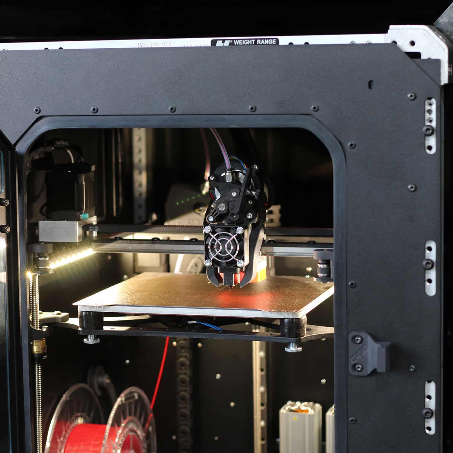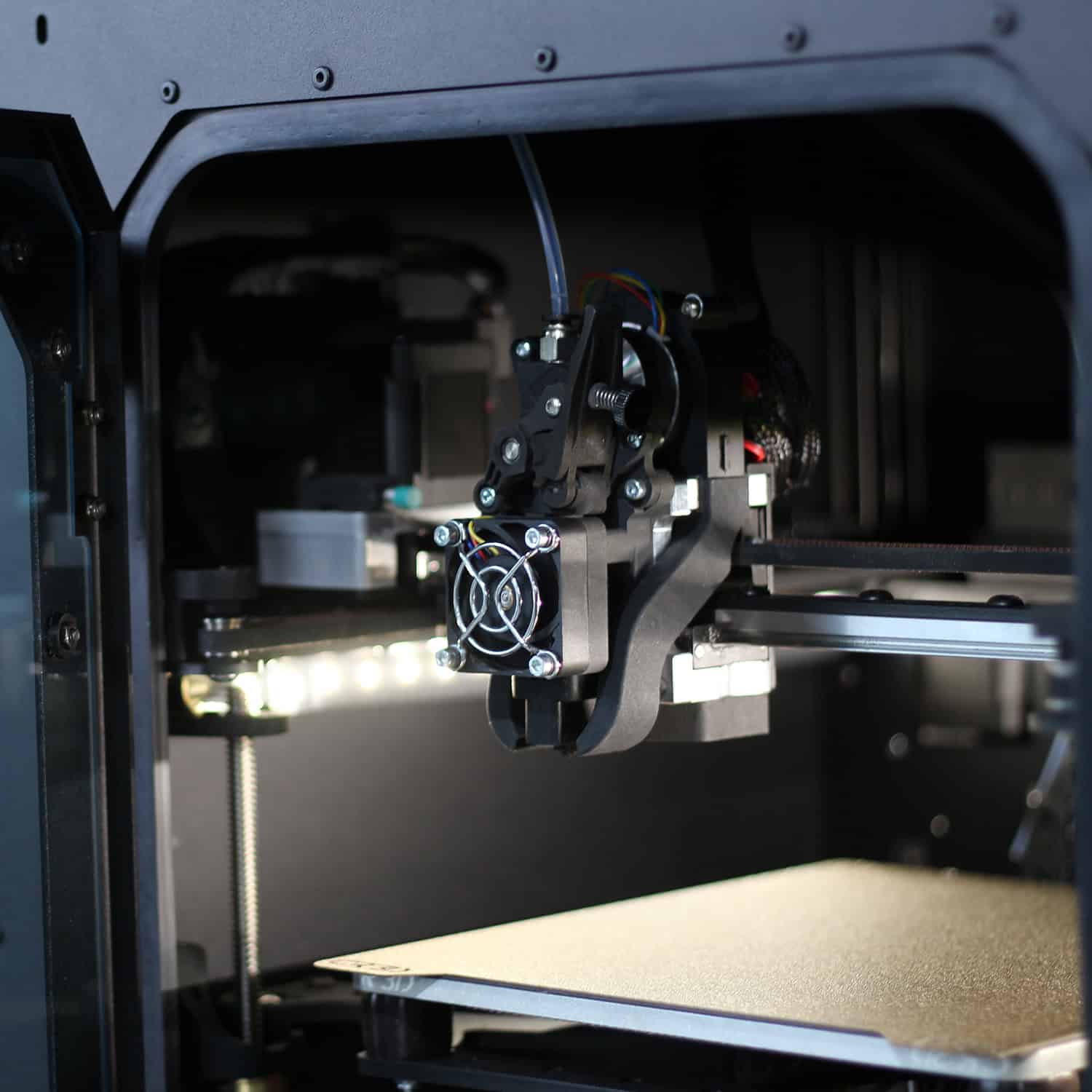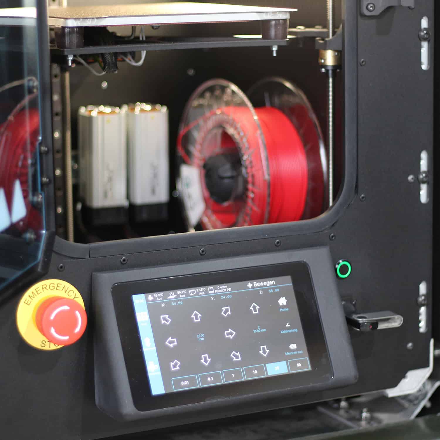 Der aktiv geregelte Bauraum erreicht bis zu 60 °C und verhindert Warping sowie Layer-Delamination bei anspruchsvollen Kunststoffen.